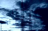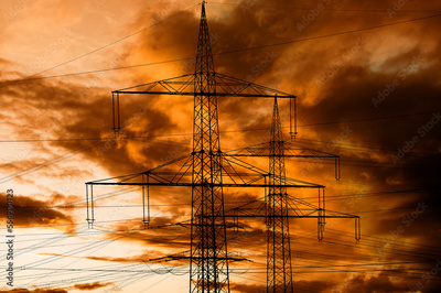 high voltage pylons for electricity and power against sky with dramatic clouds