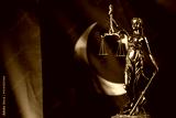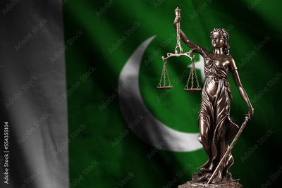 Pakistan flag with statue of lady justice and judicial scales in dark room. Concept of judgement and punishment, background for jury topics