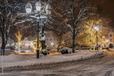 Rynek starego miasta zimą w nocy, Wodzisław Śląski w Polsce zasypany śniegiem z choinkami i światełkami świątecznymi