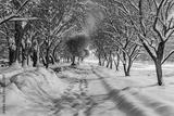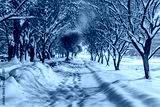 Mocno zasypane śniegiem droga i chodnik w mieście przemysłowym na Śląsku w Polsce, Jastrzębie-Zdrój nocą.