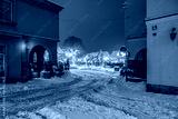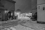 Rynek starego miasta zimą w nocy, Wodzisław Śląski w Polsce zasypany śniegiem z choinkami i światełkami świątecznymi