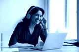 Happy freelancer professional woman in big bright headphones talking on video call, speaking at laptop, smiling, laughing, enjoying online communication. Freelance employee listening to music