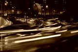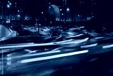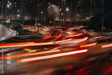 Evening car traffic in a big city. Cars in motion and standing in traffic jams. Long exposure exposure and headlight trails