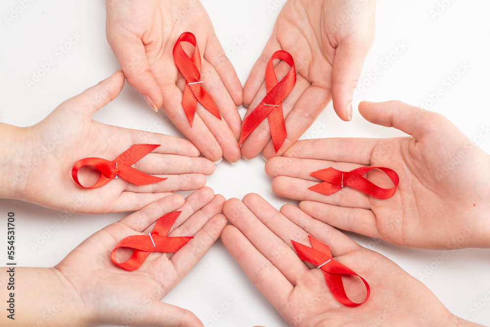 Health care and medicine concept. AIDS awareness. Many people hands are holding red awareness ribbons. International AIDS Day