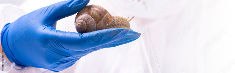 A scientist takes mucin from a snail in a test tube. Study of the properties of snail mucin. The use of snail mucus in cosmetology. Skin care and beauty concept