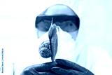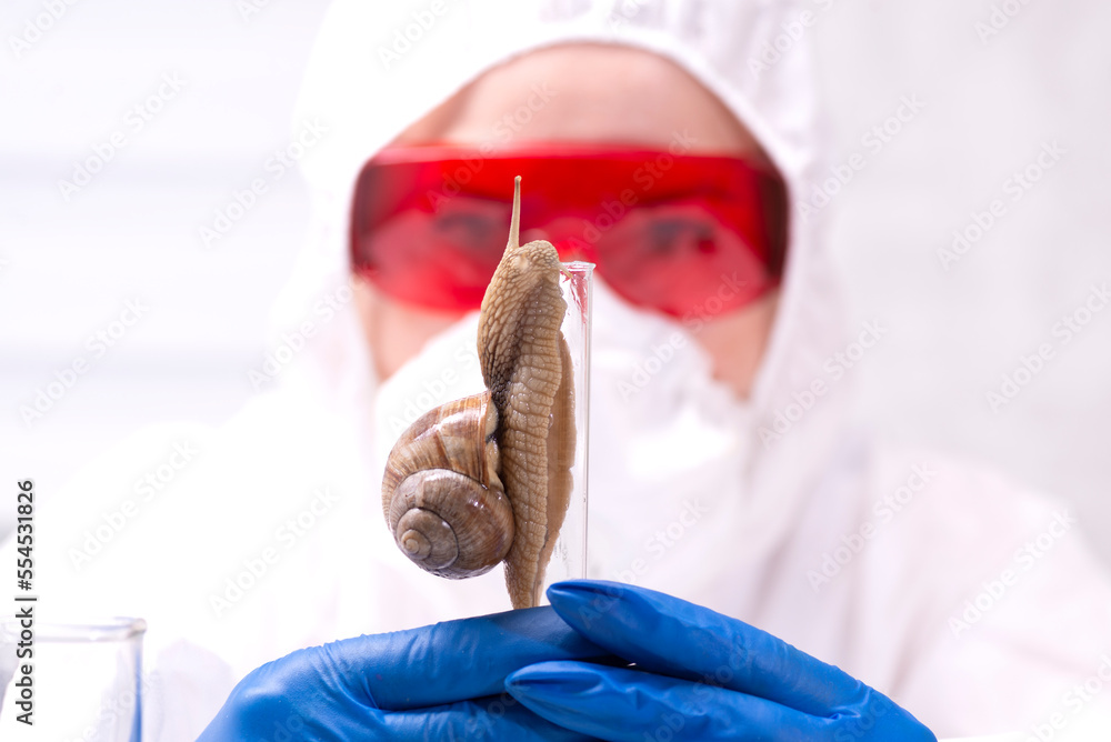 Scientist and snail on a chemical test tube. Study of the properties of snail mucin. The use of snail mucus in cosmetology. Skin care and beauty concept