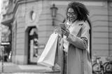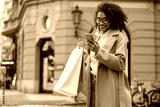 Fashion afro american woman after shopping with paper bags standing in city and using phone