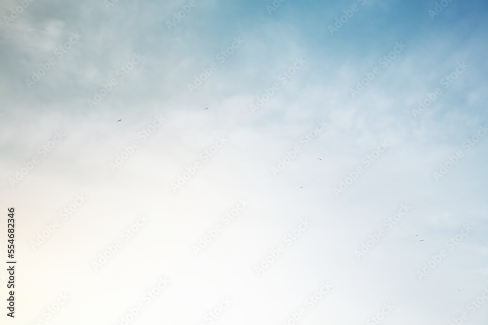 Birds flying in white sky. White background with space for text. Seagulls and flamingos flying in Leucat, France. Narbonnaise Regional Natural Park in the Mediterranean Sea.