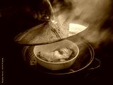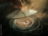Chef's hand opening the lid of a chicken steamer There was smoke coming out. there is sunshine in the morning