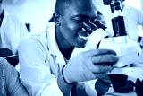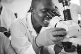 Science, microscope and students learning in class, classroom physics and happy with research in a lab. Innovation, scientist and African teenager in high school studying microbiology for education