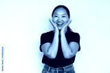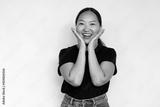 Portrait of happy young woman touching face and looking at camera over white background. Asian lady wearing black T-shirt and jeans expressing excitement. Admiration and affection concept