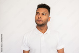 Portrait of pensive young man looking away. Male Indian model with brown eyes and curly hair in white polo shirt dreaming or making important decision. Thought, dream concept