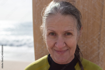 Portrait of happy aged female surfer near sea. Attractive Caucasian woman in wetsuit resting on shore after surfing in sea smiling, looking at camera. Healthy lifestyle, sport for aged people concept