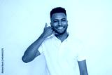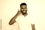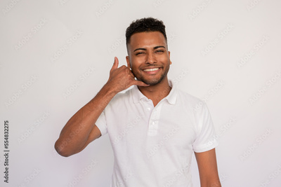 Portrait of happy young man making call gesture over white background. Latin American guy wearing white T-shirt looking at camera and smiling. Contact and advertising concept