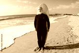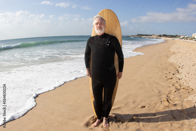 Portrait of happy aged man enjoying surfing on sunny day. Grey-haired man in wetsuit holding big board behind his back on sand near sea and looking at camera. Adult people healthy lifestyle concept