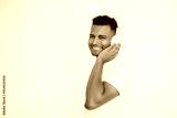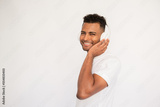 Cheerful young man listening to music in headphones. Male Indian model with brown eyes and curly hair in casual clothes wearing headphones enjoying music. Lifestyle, music concept