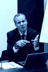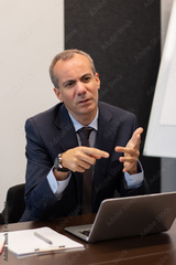 Portrait of business leader talking of affairs. Serious and strict man discussing with employees future projects, planning strategy. Business ideas and growth strategy concept