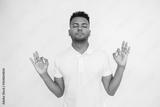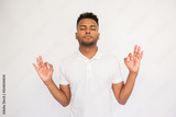 Relaxed young man meditating with closed eyes. Male Indian model with closed eyes and curly hair in white polo shirt showing mudra sign reaching inner balance. Yoga, harmony concept