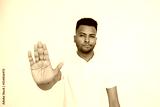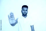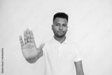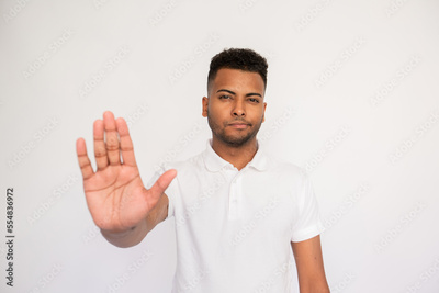 Serious young man showing stop sign. Male Indian model with brown eyes and curly hair in white polo shirt showing his palm as stop sign. Forbiddance, advertising concept