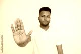 Close-up of stop sign made by serious young man. Male Indian model with brown eyes and curly hair in white polo shirt showing his palm as stop sign. Forbiddance, advertising concept