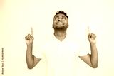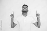 Cheerful young man pointing above at copyspace. Male Indian model with brown eyes and curly hair in casual clothes presenting advertisement. Advertising, social media concept