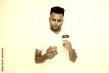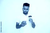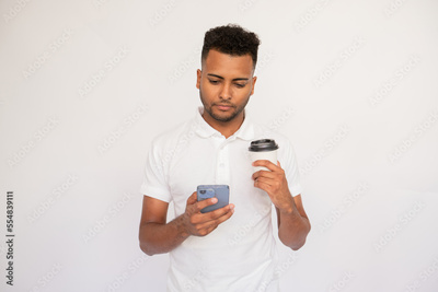 Office employee with smartphone and cup in his hands. Male Indian model with brown eyes and curly hair in white polo shirt using smartphone and holding cup of beverage. Coffee break concept