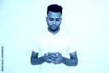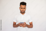 Concentrated young man using smartphone in his hands. Male Indian model with brown eyes and curly hair in casual clothes looking at mobile screen reading message or news. Modern technology concept