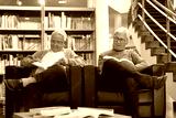 Positive aged men reading together. Two gray-haired students enjoying studying in university library finding information about technologies and discussing it. Studying of adult people concept