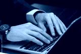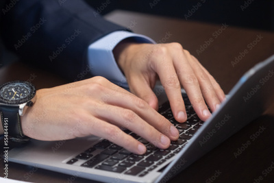 Close-up of young businessmans hands on keyboard. Caucasian man typing on computer in office preparing financial report and data analysis on prices on stock market. Business growth strategy concept