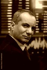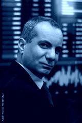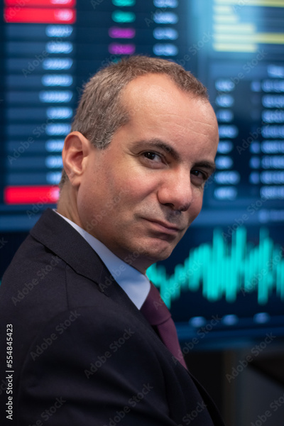 Portrait of stock market trader on his workplace. Man professionally doing his job having rest sitting in front of big digital screen and looking at camera. Business growth strategy, trading concept