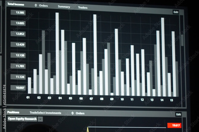 Close-up of stock market graph with income data. Black display with numbers as visual instrument of forecast price movements, changes positions for making decision. Business growth and finance concept