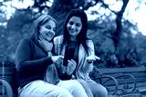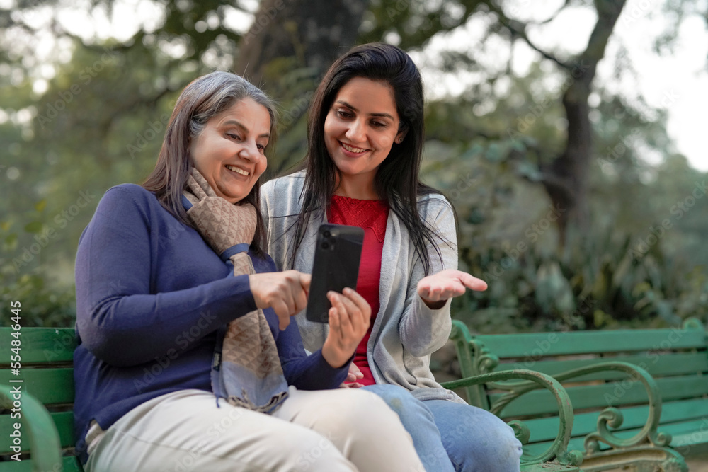 Two indian woman in warm wear and talking on video call at park.