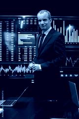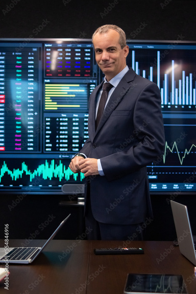 Portrait of businessman posing for camera. Smiling man working in office making financial analysis of stock market data with pleasure, looking at camera. Financial analytics, business strategy concept