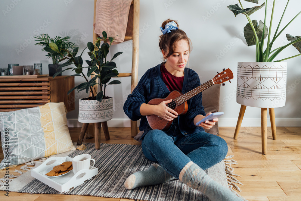 Young Woman using mobile phone while playing ukulele guitar in modern Scandi interior home. Online learning concept. Tutorial lessons via mobile application. New Hobby, resolution to learn new skills