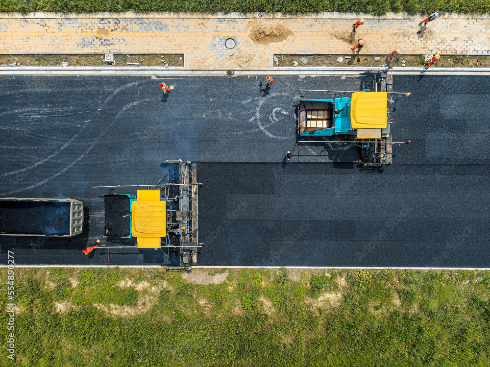 Aerial view of construction site is laying new asphalt pavement. road construction workers and road construction machinery scene. Highway construction site scene.