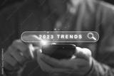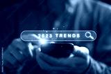 Businessman holding smartphone with searching bar with 2023 trends year for marketing monitor and business planing change concept.