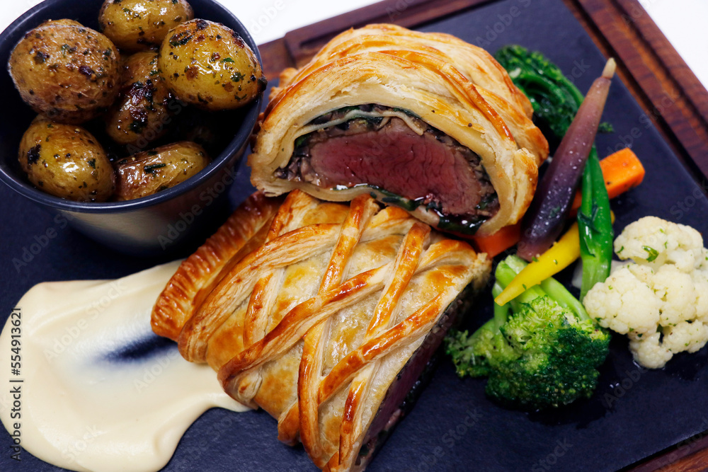 traditional beef wellington recipe with puff pastry, similar to french classic dish pithivier