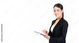 Young asian business woman company worker smiling and using digital tablet She standing over white background copy space Business lady confident manager worker use modern technology digital tablet
