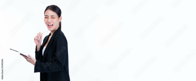 Young asian business woman company worker smiling and using digital tablet She standing over white background copy space Business lady confident manager worker winking her eyes to camera with happy