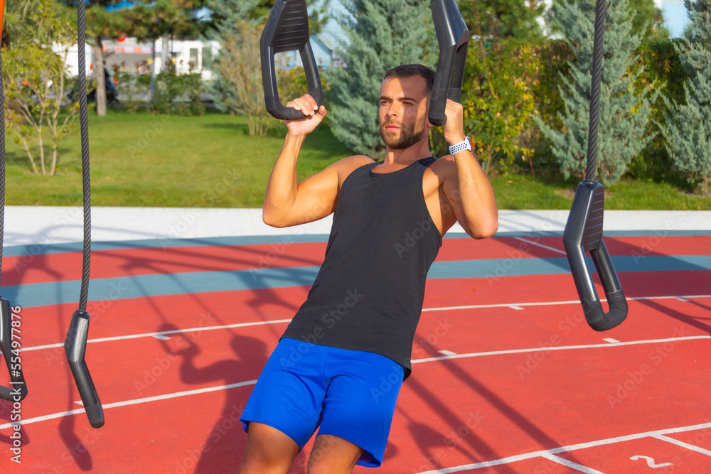 Man climbs a wall with a rope. Rope climbing exercise in a fitness gym in a city park.