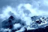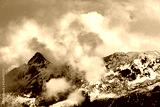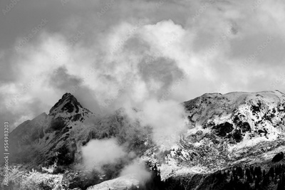 mountain in the fog in b/w