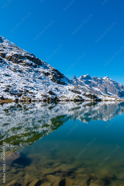 The clear tarn reflects the surrounding alpine panorama (Tobelsee, Vorarlberg, Austria)