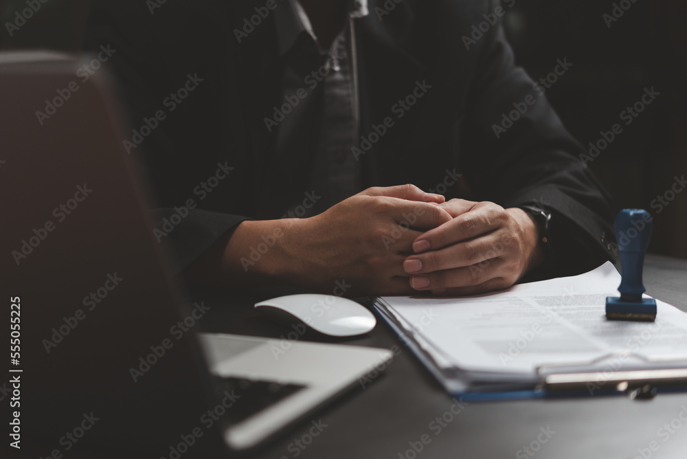 Man stamping approval of work finance banking or investment marketing documents on desk.