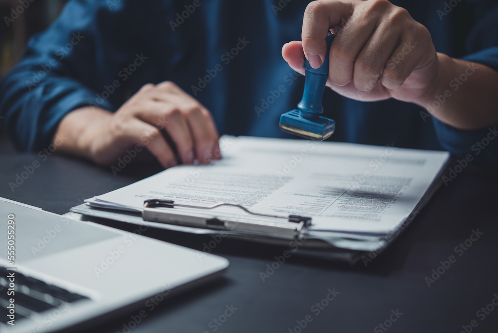 Man stamping approval of work finance banking or investment marketing documents on desk.