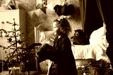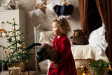 girl riding toy horse in Christmas home. Merry Christmas and Happy Holidays