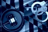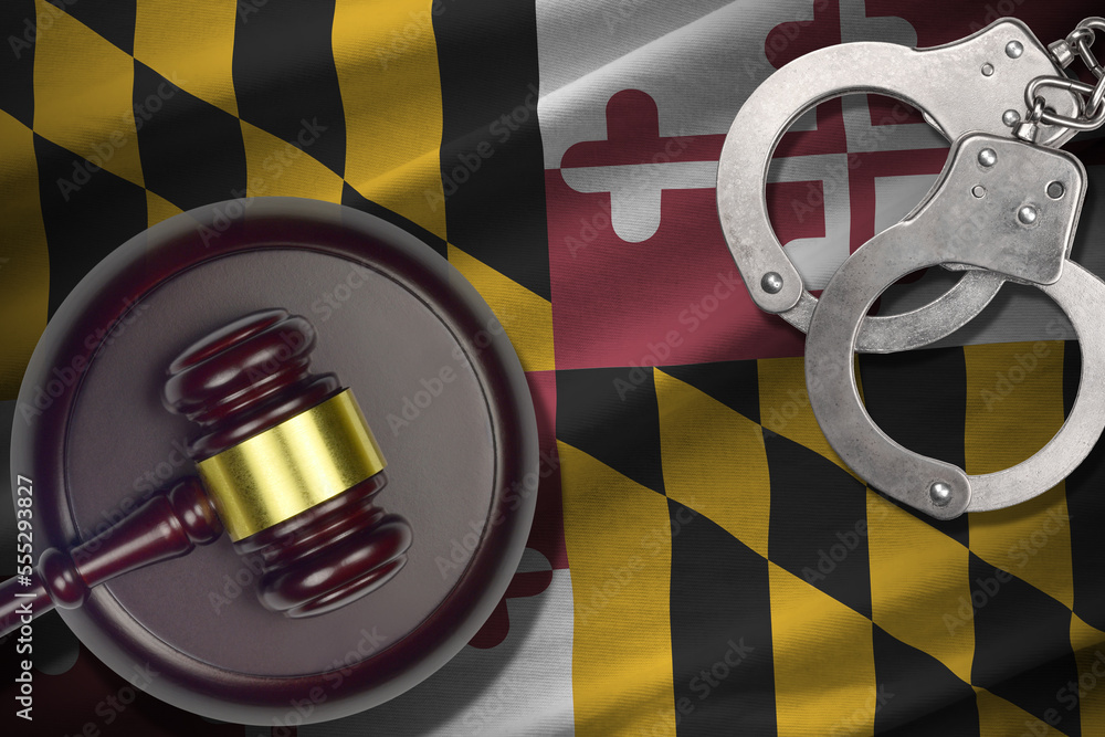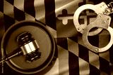Maryland US state flag with judge mallet and handcuffs in dark room. Concept of criminal and punishment, background for guilty topics