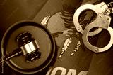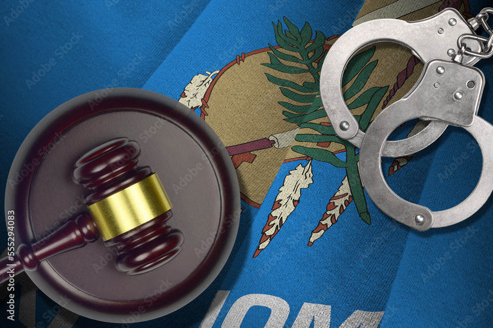 Oklahoma US state flag with judge mallet and handcuffs in dark room. Concept of criminal and punishment, background for guilty topics