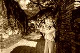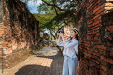 Portrait pretty young woman pose having fun and happy in famous the ancient palace in Ayutthaya with camera travel with take photo is travel holiday relaxed concept.