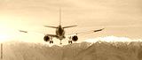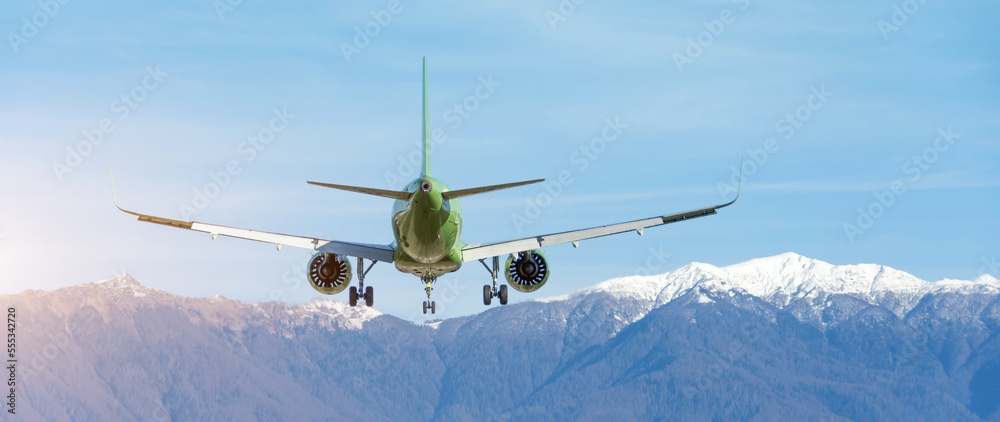 Passenger civil aircraft approach for landing lands at the airport against the backdrop of massive snow capped mountains. Panoramic wide view banner format.