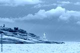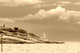Ostseeküste mit Felsen und Leuchtturm auf der Insel Blå Jungfrun in Schweden